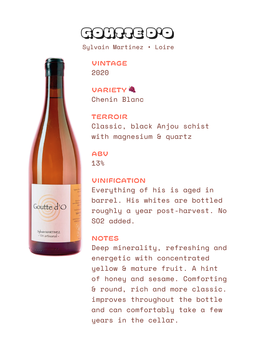 Vinification: Everything of Sylvain’s is aged in barrel. His whites are bottled roughly a year post-harvest. No SO2 added.