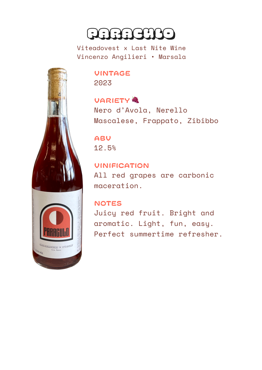 Notes: Juicy red fruit. Bright and aromatic. Light, fun, easy. Perfect summertime refresher.