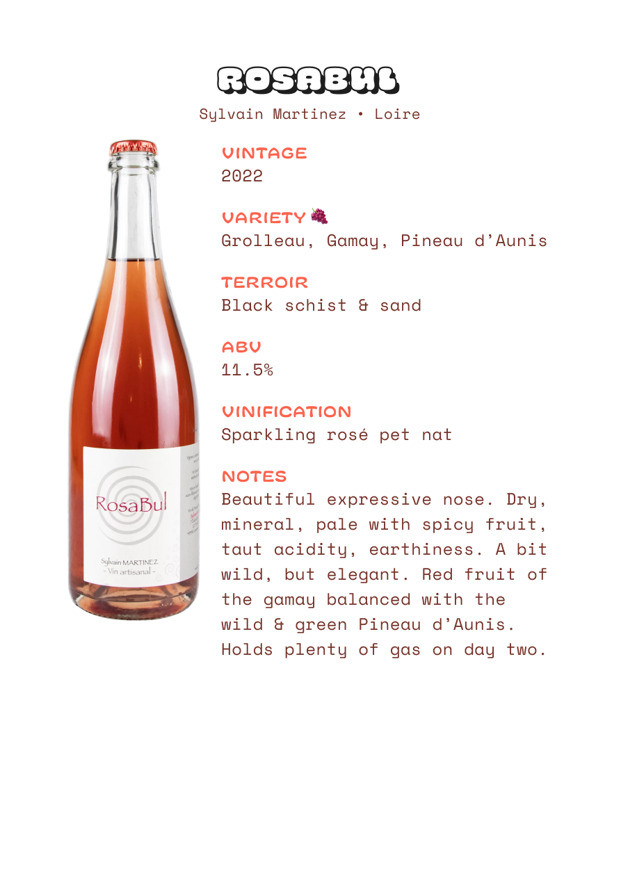 Vinification: Classic black Loire schist. Sparkling rosé pet nat