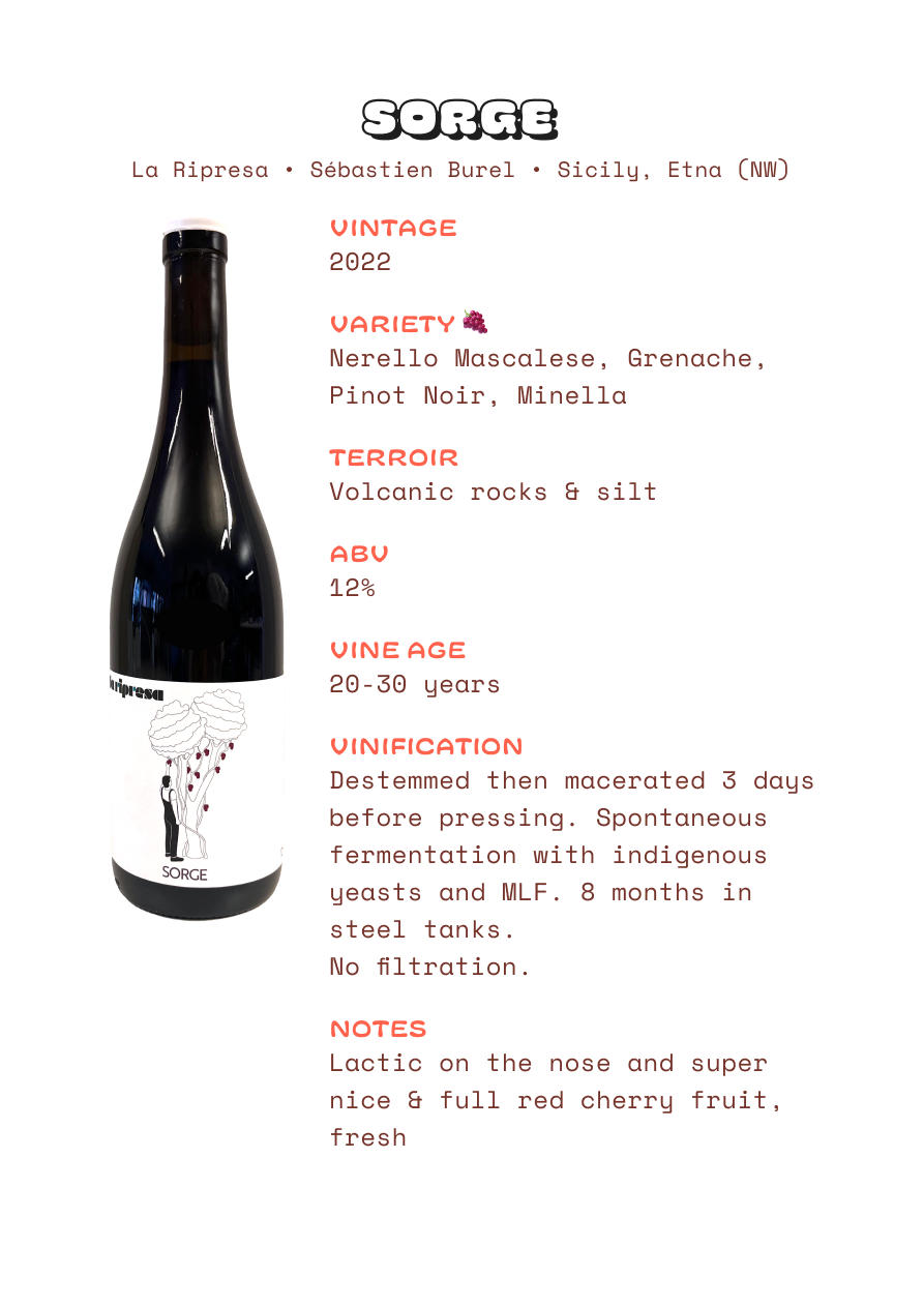 Vinification: Terroir is volcanic rocks (basalt) & silt. Vines 20-30 years old. Destemmed then macerated 3 days before pressing. Spontaneous fermentation with indigenous yeasts and MLF. 8 months in steel tanks.