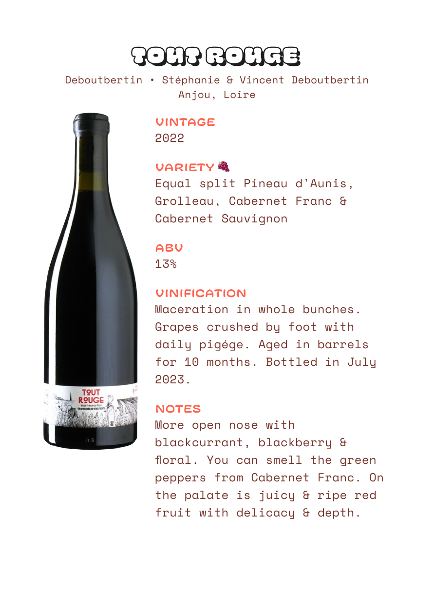 Grapes: Pineau d'Aunis, Grolleau, Cabernet Franc & Cabernet Sauvignon (equal split)