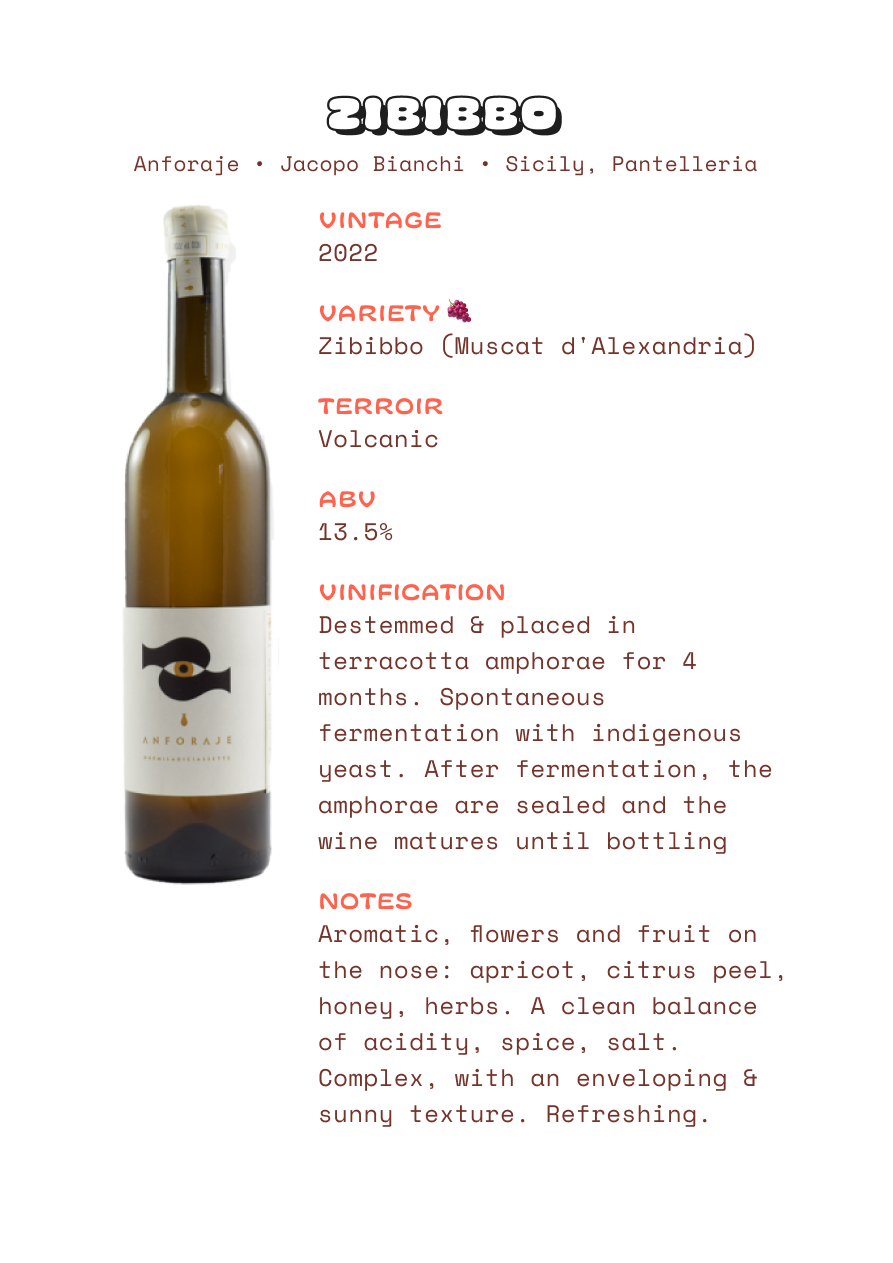 Vinification: Volcanic soil. Destemmed & placed in terracotta amphorae for 4 months. Spontaneous fermentation with indigenous yeast. After fermentation, the amphorae are sealed and the wine matures until bottling